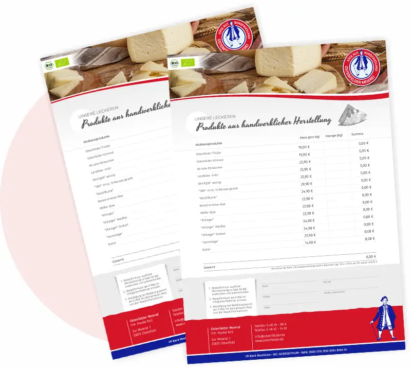 Bestellformular ausfüllen (Mindestmenge je Käse 0,5 kg), ausdrucken und unterschreiben.